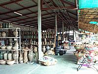 午後は遺跡を離れて、イサーンの工芸品を訪ねました。まずシルクの産地として有名なパクトンチャイへ行きましたが、ちょうどお昼時で機を織る人はいません。織機だけ見せてもらいましたが、どうやら糸にあらかじめ決められた順番と長さで色を着け、それを織り上げていく方法のようです。つまり、模様を作るのに色の違う糸を組み合わせるのではなく、最初から模様ができることを計算した染めが施された糸を組んでいくわけで、非常に高い精度が必要になるわけです。さらにシルク・ショップでのお買い物タイムで、私はすぐに飽きてしまいましたが、ユーコさんは目を輝かせて次々に絹布を見て回り、赤紫地のきれいな布をさんざん価格交渉した末に3,500バーツでお買い上げ。この店ではせいぜい15%までしか下げてくれないのですが、それでもバンコクで買えばこの3倍はする、とほくほく顔でした(帰宅してからのエトさんの査定でも「いい買い物だ」と合格点をもらえました)。ついで足を運んだのは焼き物の店が並ぶダン・クウィアンで、ここで私はクメールの建物を特徴づける赤い砂岩の小さな彫り物を買いました。