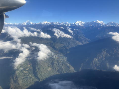 ルクラ行きの飛行機に乗るなら、左側の席に座るのが定石です。緑と茶色の山々の彼方に白銀の巨峰たちが横一線に並ぶさまは、何度見てもモチベーションをかき立てられます。