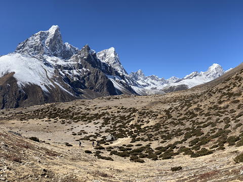 丘の上に出ると、クーンブ・コーラ左岸の平坦地とその上の道がずっと奥へと続いている広闊な眺めを堪能することができます。これを左から見下ろしている山々は左端がタボチェ、その隣が先日アユミさんが登頂したチョラツェ、そして右奥の白い山はOさんが登ろうとしているロブチェ・イーストです。