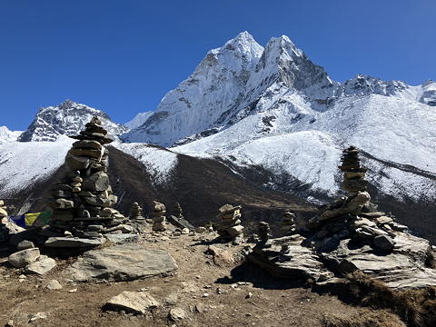 橋を渡ってしばらくの歩きで、前方にディンボチェが見えてきました。その左上にある黒い山はNangkartshangで、そのピーク手前の5000m強付近までのハイキングは安全で効率の良い高度順応トレーニングになりますが、昨日アマ・ダブラムBCまで登っているので今回はそこまでは登りません。
