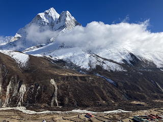 反対側にはもちろんアマ・ダブラムが、パンボチェからの眺めとは異なり北西稜の北面を見せた荒々しい姿でそこに聳えています。