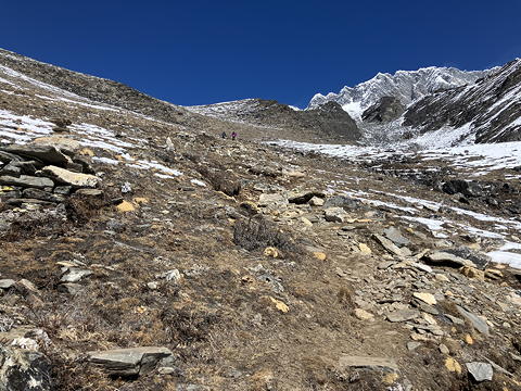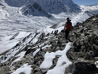 先ほど緊張した雪のパートを下るのは嫌だなと口に出したら、ソナムはこれを左の岩の斜面から回避するルートどりで下っていきます。なんだ、そんな道があるのなら登りでもそちらを辿れば緊張せずにすんだのにと思いましたが、実はシェルパは氷化した雪でも苦にせずツボ足で上り下りできるということを、後日の2回の氷河横断で知ることになります。また、そうした能力を持たない標準的な日本人である私は、この山行を通じて「チェーンスパイクは常時リュックサックに入れておくこと」という教訓を得ました。