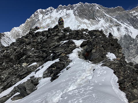 振り返ればそこにあるアマ・ダブラム。その角度を見て、自分がそれなりに高い場所まで登ってきていたことを実感しました。視線を下げれば、1時間前に登り着いて風に吹かれ始めた鞍部も眼下に見えています。