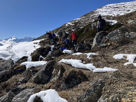 そんなことを考えながら下っていくと、今日ディンボチェからチュクンにやってきたばかりのチェパ隊と遭遇しました。合言葉はもちろん「日本の方ですか?」「奇遇ですね!」です。彼らはチュクン・リの頂上まで行くわけではないものの、少しでも標高の高いところに身体を置いておこうという考えからこの山の途中まで上がってきていたようでした。
