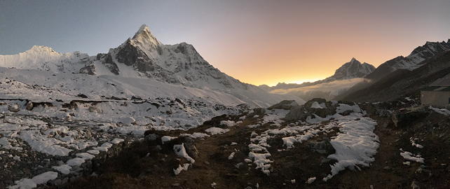 しかし、外に出ればすばらしい夕景色が広がっていました。この眺めを見るだけのためにチュクンにおいでなさい、と人に勧めたくなるような景色でしたが、実はこのときチェパ隊の方は今後の予定について方針転換を迫られていたようです。もともとのプランでは島トリオはチュクン・リで高度順応の後にアイランド・ピークのBCないしハイキャンプ(以下「HC」)に向かい、一方Oさんは(ディンボチェから)ペンバに連れられてロブチェに移動してEBCやカラ・パタールで高度順応をした上で、アイランド・ピークを片付けたチェパの到着を待ちロブチェ・イースト登攀に臨むはずだったのですが、予報によればこれからしばらくは稜線上に風速20m/sの強風が吹き続けるようで、このままアイランド・ピークに向かうのはとても無理。このため明日は全員でディンボチェ経由でロブチェに向かうことにしたそうです。と言うことは、ロブチェ・イーストが目的であるOさんはともかく、島トリオはチュクンからロブチェに行ってそちらでのアクティビティ(EBCとカラ・パタール)をこなした後、再びぐるっとチュクンに戻ってきてアイランド・ピークを目指すタフなスケジュールになるわけです。厳しいなぁ、大丈夫だろうか?とこのとき私の頭の中では島トリオの行く末に対する不安が頭をもたげていたのですが、結果的に彼らがこの一見迷走とも思える行程をこなしてアイランド・ピークの登頂を実現したことを知ったのは8日後のことでした。