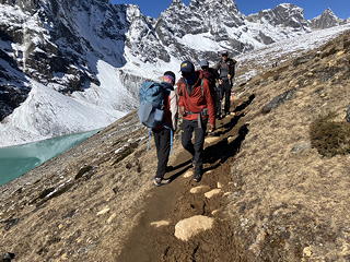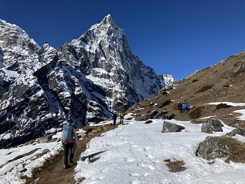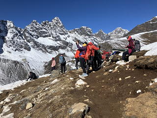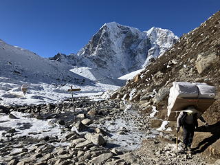 歩いているうちにゾンラからロブチェへ向かうトレッカーの数が増えてきました。これはチョ・ラを我々とは逆コースで越えてきた人たちということになりますが、見ればソナムは彼らとすれ違うときにほぼ例外なく谷側で避けています。なぜ安全な山側で避けないのか?と不思議に思いましたが、すぐにピンときました。これは彼が不浄ではない右半身を対向者に向けるためです。ソナムに確かめてみたところこの推理は正解で、相手がゾッキョやヤクの場合は安全重視で山側に立つのだということでした。そんな話をしているうちにルート上のレストポイントに到着し、ここで実に陽気なロシア人一行がわいわい語り合ったりチョラ・ツォをバックにポーズをとったりするのをしばらく眺めました。