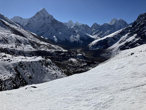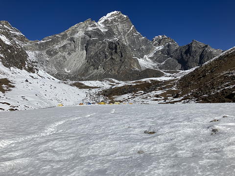 この道が分岐するあたりの右側には特徴的な平坦地があり、そこはロブチェ・イースト登攀のBCの一つとして利用されています。私も2018年にこのBCに数日泊まったのですが、この日も雪原の奥に小規模なテント村ができていました。これらの奥に見えている立派な山は、もちろんロブチェ・イーストです。しかし、このときすでにOさんはあの山の登頂を終えて下山にかかっていたことを、私は知る由もありませんでした。