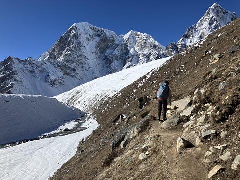 十分に日が昇った8時に出発。まずはクーンブ氷河右岸の道を下流へ進み、この道が氷河の末端で谷を渡ろうとするところでこれと分かれ、引き続き右岸を進む道に入ります。