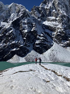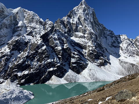 チョラツェの足元には堰止湖であるチョラ・ツォ。エメラルドグリーンが神秘的です。