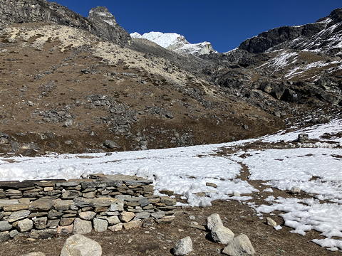 それがこれらの石組みで、これは何かと言うとロブチェ・イーストへのもう一つのBCです。上の写真の右奥にはプジャで使うものと思われる石組みもあり、さらに上の方に見えているのはロブチェ・イーストのHCに通じる尾根です。なるほど、こちらはこんなふうにもろもろ完備されたキャンプ地だったのか。