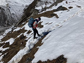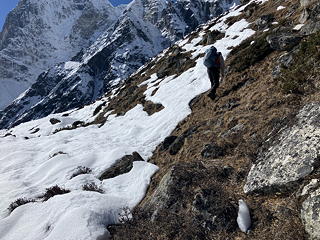 そんな面白い体験はできましたが、ソナムは完全にルートを見失ったようで、正規ルートへ回帰するまで道なき斜面をしばらくトラバースする羽目になってしまいました。これに関してはソナムも「こっちの方が安全だと思ったんですが……すみません」と謝っていましたが、この程度のトラバースは丹沢バリエーションでいくらでも経験済みなので無問題です。