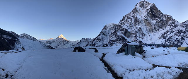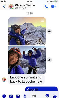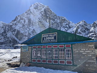 投宿したのはGreen Valley Lodgeで、この「Green」というのはたぶんチョラ・ツォの色からとったものだと思いますが、それよりもロッジの正面から見て右前方に近いチョラツェと中央遠くのアマ・ダブラムが実に立派です。この眺めを堪能してからロッジでWiFiカードを買い求め通信を再開してみたところ、なんとチェパからOさんと共にロブチェ・イーストに登ったという連絡が入っていました。昨日HCに登ったのは高度順応ではなく、すでにサミットプッシュに入っていたというわけです。ここまで高度順応と言えるのはディンボチェのNangkartshangの5000mちょっとしか行っていないはずのOさんが、いきなりロブチェ→HC(泊)→サミット→ロブチェの行程をこなしてしまったことに私もソナムも仰天してしまいましたが、このニュースを聞いたソナムは「彼女はたくさん食べてましたから」と思いがけない感想を漏らしました。言われてみれば確かにOさんは、ダルバートを必ずおかわりしていましたし、何を食べてもおいしそうに食べていて、その小柄な身体に似合わない健啖ぶりは胃が四つあるのではないかと疑いたくなるほどでした。そして「食べられない者は登れない」というセオリーはこれまでのエクスペディションで私自身が実感しているところです。何はともあれ、Oさんおめでとう!本当にすごい。そして一つ肩の荷を下ろしたチェパは、これからは島トリオをアイランド・ピークの頂上に立たせることに専念できるはずです。