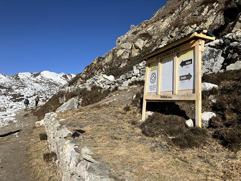 ロッジを出て、まずは上流方向に歩きます。出だしに立っていた掲示板には「Gokyo 2hour」と書かれていますが、本当かな?