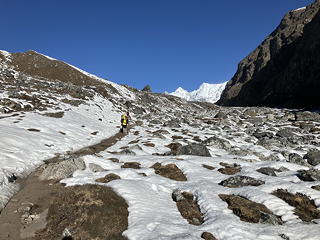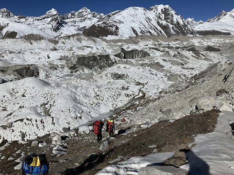 ゴズンパ氷河はチョ・オユーの直下から流れ出してダグナのさらに下流まで続いており、その全長36kmはヒマラヤで最長です。ゴーキョはこの氷河の右岸側にあって、左岸側にあるダグナと比較するとやや上流に位置するため、氷河を渡るルートはこの右岸上流側を目指して斜めに付けられています。