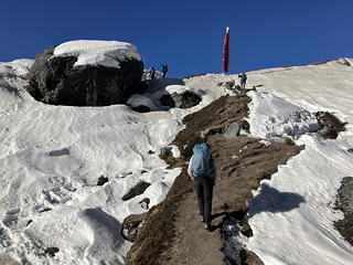 歩きやすい道をしばらく歩いて、やがて坂道を登ってモレーン上に標柱が立つ場所に出ると、そこが氷河の横断ポイントでした。