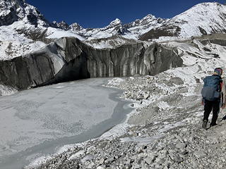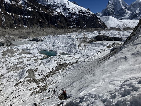 どうにか氷河を無事に渡りきって右岸のモレーン上から振り返ると、ずいぶん大勢のトレッカーがこの氷河を横断している様子を見ることができました。皆さんも、どうぞご無事で。