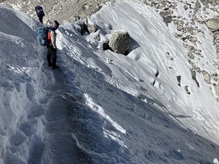 ルートは明瞭な踏み跡によって認識でき、この時間帯は多くのトレッカーが行き来しているので迷う心配はなさそうですが、それにしてもアップダウンが繰り返され、しかも気温の上昇と共にパラパラと岩屑が崩れてくるところがあったりして気が抜けません。これでは、もしチョ・ラを越えた後にダグナに泊まらず引き続きゴーキョを目指していたら、心身とも相当に疲弊したことでしょう。