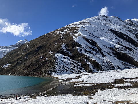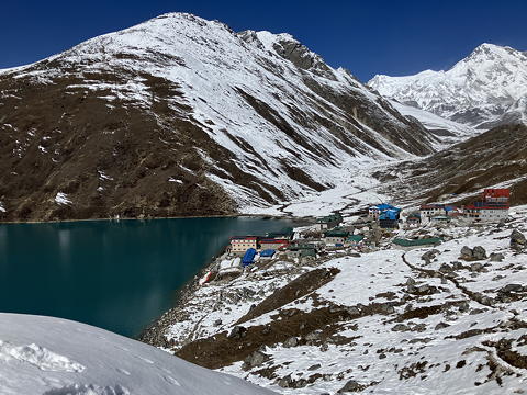 モレーンを越えて少し歩くとゴーキョが見えてきました。ここは人気の観光ポイントらしく、たくさんのロッジが建ち並んでいます。そしてその奥のもっこりとした山がゴーキョ・リ、左の湖は現地名ではDudh Pokhariですが、ゴズンパ氷河の右岸に連続する湖の下流側から数えて3番目の湖であるため、3rd Lakeということにもなります。たしかチョラツェを登ったアユミさんたちも、ナムチェバザールからまずここにやってきて高度順応し、それからチョラツェBCに向かっていたはずです。