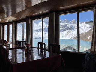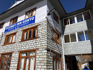 荷物を置いた宿はFitzroy Inn Gokyo。我々登山者にとってはFitzroyと言うと条件反射的にパタゴニアを思い浮かべるので「なんで?」と疑問符が心の中に浮かんでしまいますが、その点には目をつぶれば、ダイニングからの湖の眺望がすばらしく厨房も立派、トイレも綺麗なきちんとしたロッジでした。