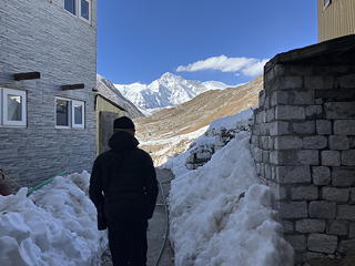 ロッジの近くから眺めてみると、ゴーキョ・リはなだらかで登りやすそうな姿をしています。ゴーキョから山頂までの標高差はざっと600mで、これはゴラクシェプからカラ・パタール山頂までの高距(約480m)より若干大きい値ですが、サンセットに間に合うように登ればいいので気は楽です。