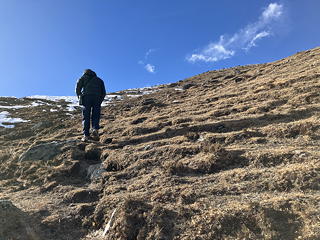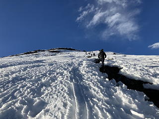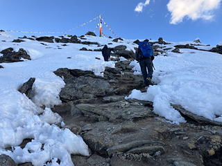 初めは土の上をジグザグに、ついで雪が出てきたらその中の踏み跡を辿り、2時間ほどをかけて氷化した雪と岩に覆われタルチョがはためく山頂に到着しました。