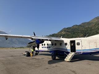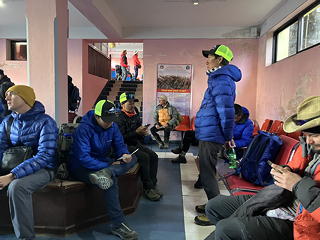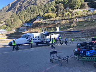 いよいよ待望のカトマンズへの帰還の日。しかし残念ながら直行便ではなくマンタリのラメチャップ空港に飛んで、そこから車に6時間揺られてカトマンズを目指すことになっています。ただしF氏だけは、ヘリコプターでカトマンズへ直行することになりました。どうやらF氏はルクラでの凍傷の治療の際に水疱を破ったことから(たぶん)何らかの感染を生じたらしく、昨日も体調が悪いながら祝宴に参加してくれていたものの、その後はずいぶんつらい夜をすごしていたようです。このため彼は、飛行機のキャンセル料100%、ヘリコプター代○万円となかなか厳しい出費を余儀なくされてしまいましたが、きっとデンディさんが効果てきめんの書類を書いてくれて、保険金がつつがなく下りることでしょう。