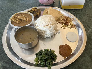 前回の旅でも感心したことですが、ネパールでは電気自動車がインフラも含めて意外に普及しています。我々をマンタリからカトマンズまで送ってくれる車も1時間ほど走ったところで充電休憩をとることになり、この時間を利用して我々もランチタイムとしました。出てくる料理は当然ダルバートですが、その付け合せに辛い味の揚げた川魚が含まれていたのにはちょっと感動しました。なにしろ久しぶりの魚です。ただ、これを食べるとますます日本の海の魚を、もっと言えば刺身料理を食べたくなってしまいました。