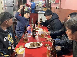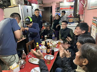 夜はペンバの案内で再びチェパの奥さんのモモ屋に集合。カトマンズに戻って体調を回復させたF氏も参加して(ただしアルコールは控えて)皆でおいしい料理に舌鼓を打っていましたが、この夜ネパール入りして明日には早くもルクラに飛ぶという日本からのお客二人を空港から連れてきたチェパが合流したところで、昨夜に続いてResham Fiririを流しながら今度はチェパに対するサミットボーナスの授与式が行われました。